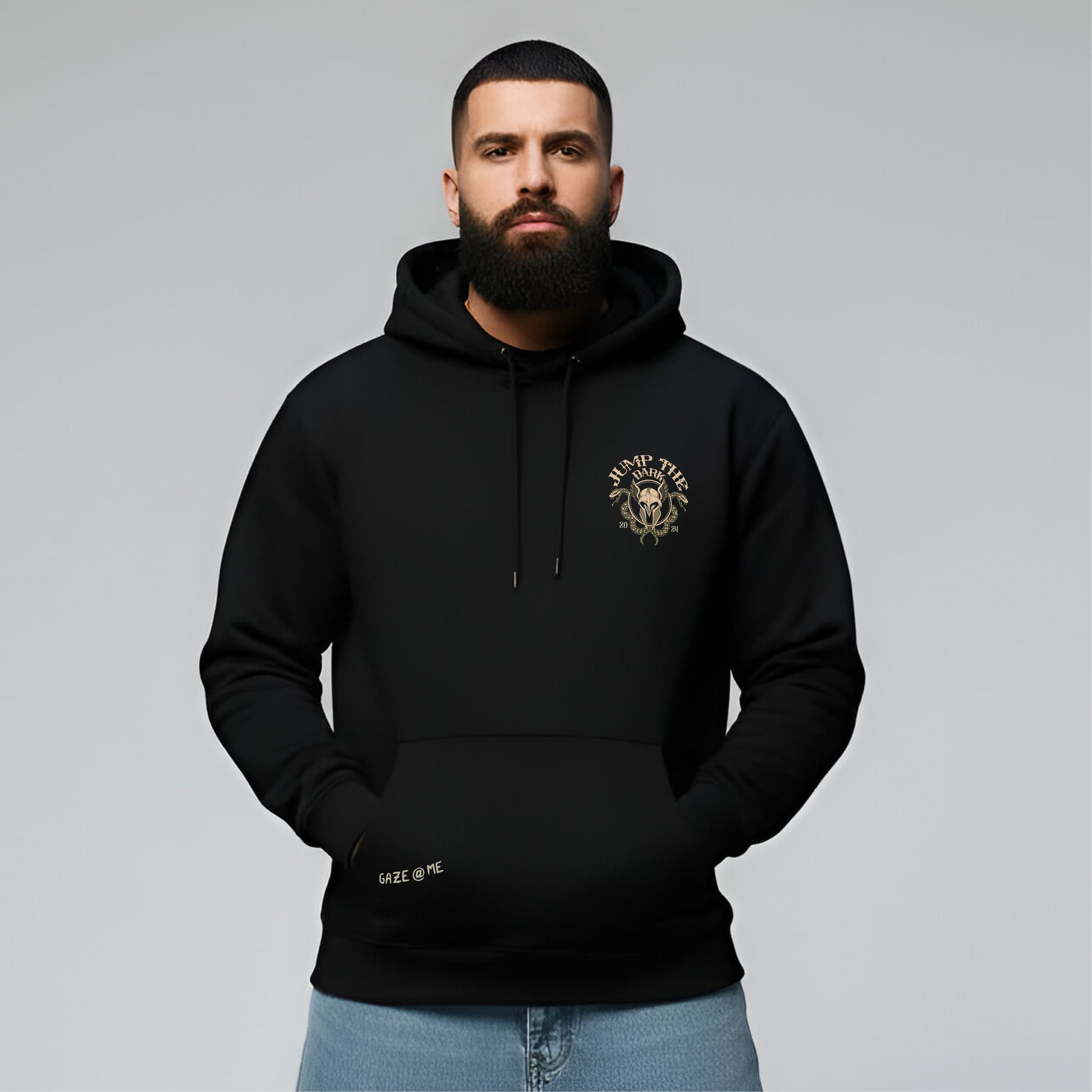 Own the power of legend with the Stoneborn Grace Graphic Hoodie from Jump the Dark. On the back, Medusa’s gaze dominates, her serpentine hair and piercing eyes captured in stunning detail. On the chest pocket print, Perseus’ fallen helmet tells the story of her victory — a subtle, powerful nod to triumph over the hero. This hoodie transforms ancient myth into modern streetwear, making every wear a statement of strength and defiance.